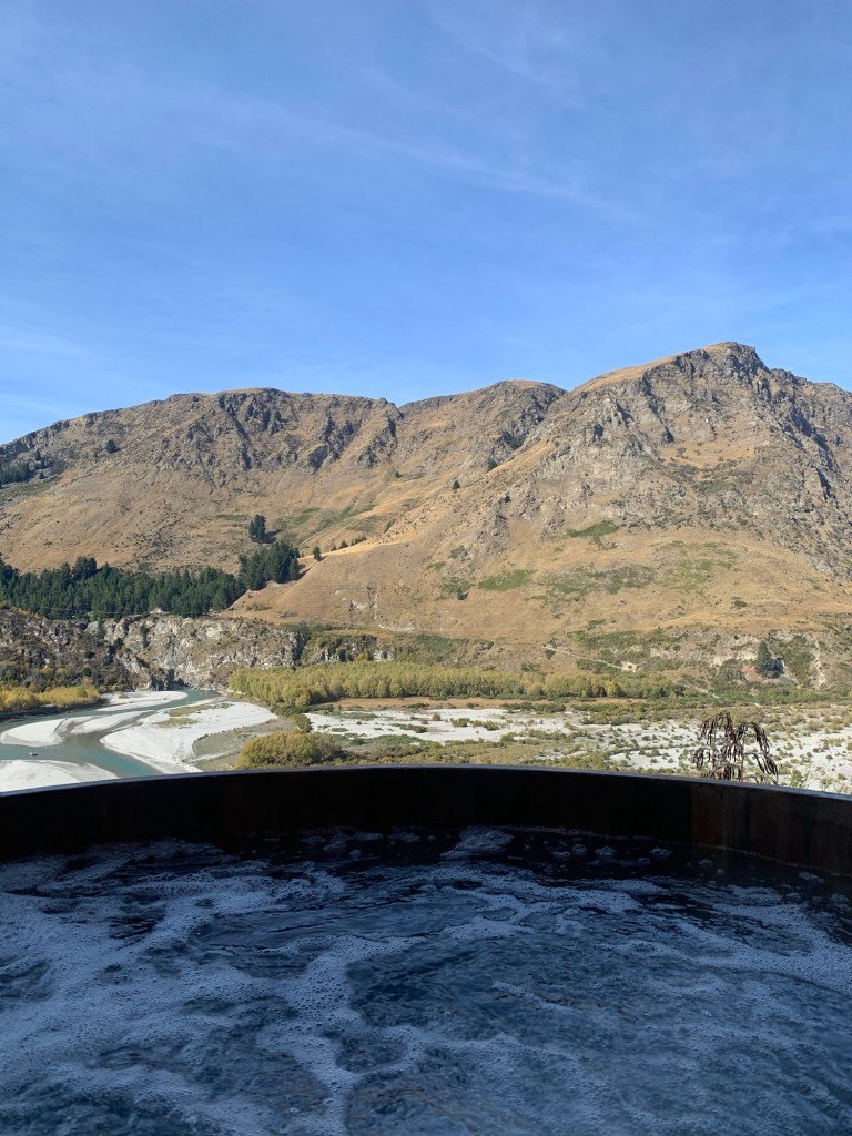 OMG – what a spectacular experience. A ten minute free shuttle ride to Onsen Hot Pools. Then an hour to soak and relax in a hot pool. A drink and treat part of the experience. We watched the Shotover jets go past several times and just savoured the amazing scenery. As you can see, the weather is incredible.