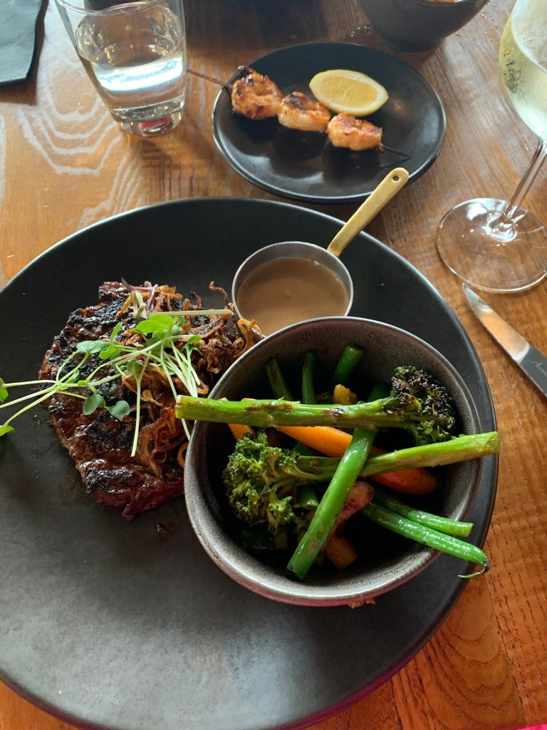 Ann – This morning when I first started writing this, it was fish tacos at Rooftop Bar and Terrace (the side of vegetables made it for me). After lunch today, it is now Flame. The rib-eye and vegetables were devine!